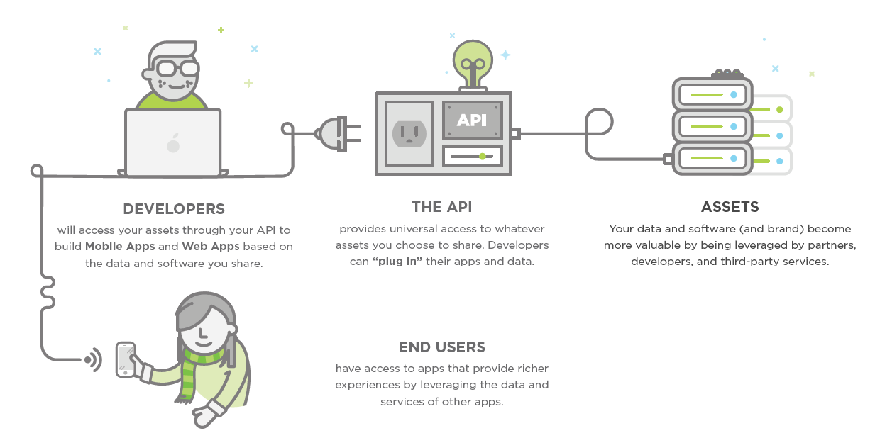 Las APIs hacen posible compartir los servicios comerciales, los activos y los datos de una manera que puedan ser consumidos fácilmente por otras aplicaciones, sin compartir la base del código. Las API se pueden considerar como ventanas al código base.